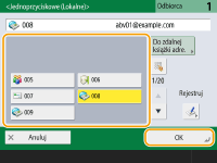 Naciśnij na <Adres I-Faks>, wprowadź odbiorcę i naciśnij na <OK>. Należy określić odbiorcę w następującym formacie: „adv01@example.com”. Aby wysyłać do urządzenia w obrębie tej samej sieci, wprowadź dane odbiorcy w następującym formacie: adv01@192.168.11.100 (nazwa odbiorcy@adres IP).