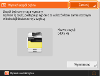 Aby uzyskać instrukcje dotyczące numeru modelu zespołu bębna, patrz Części zamienne. Treść komunikatu z prośbą o dokonanie wymiany zespołu bębna wyświetlanego u dołu ekranu różni się zależnie od zawartej umowy. Po zakończeniu wymiany zespołu bębna należy nacisnąć opcję <Zamknij>. |