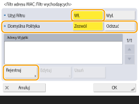 Dla <Domyślna Polityka>, wybierz <Odrzuć>, aby zezwolić na komunikację wyłącznie z urządzeniami, których adres MAC określono w <Adresy Wyjątki> w kolejnym punkcie lub wybierz <Zezwól>, aby odrzucić próbę takiej komunikacji.