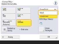 1 | Naciśnij <OOXML> wybierz <Word> z listy rozwijanej.![]() ![]() Aby zmienić język używany przez funkcję OCR, naciśnij <Ustaw Szczegóły> <Zmień> wybierz język albo grupę języków naciśnij przycisk <OK>.Wybierz język albo grupę języków zgodnie z językiem skanowanych dokumentów. |