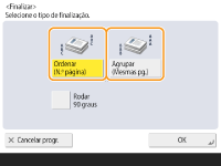 Dependendo do tipo de papel, poderá não ser possível utilizar as funções de finalização. Características técnicas do hardware Quando colocar um original no vidro de exposiçãoCarregar em <Opções> <Cópia cont. de trabalhos> no ecrã das funções básicas de cópia permite utilizar a função Ordenar/Agrupar, mesmo que o original esteja colocado no vidro de exposição.Insira um separador de trabalhos entre cada página durante a impressão de um grupoSe selecionar <Agrupar (Mesmas pg.)>, poderá inserir um separador de trabalhos entre cada grupo. Para mais informações, consulte <Separador trabs entre grupos>. <Cópia> <Separador trabs entre grupos>Quando configurar programações em <Aced.fich. guardados>Só pode utilizar as funções de acabamento quando imprimir ficheiros PDF/XPS. |