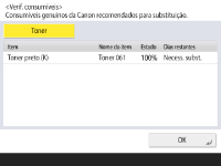 Quando carrega em <Contr. estado> é apresentado o ecrã Controlo de estado, que permite verificar o nível de toner ou outras indicações de estado.