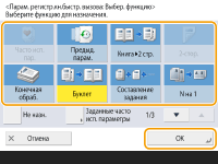 Количество элементов на экране основных функций и порядок их отображения отличается в зависимости от функции. Кнопка быстрого вызова не отображается, если в качестве кнопки быстрого вызова установлено <Не назначено>. Ниже указаны ограничения для числа клавиш быстрого вызова для <Параметры>, которые можно зарегистрировать. Копирование: 5 Факс: 4 Сканировать и отправить: 2 |