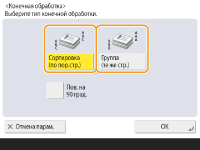 В зависимости от типа бумаги функции конечной обработки могу быть недоступны. Технические характеристики аппаратного обеспечения При помещении оригинала на стекле экспонированияЧтобы воспользоваться функцией сортировки и группировки копий оригинала, помещенного на стекло экспонирования, на экране основных функций копирования последовательно нажмите <Параметры> <Составление задания>.Во время копирования с группированием копий между каждой страницей следует вставить разделитель заданийЕсли выбран вариант <Группа (те же стр.)>, между каждой группой копий можно вставить разделитель заданий. Дополнительные сведения см. в разделе <Разделитель заданий между группами>. <Копия> <Разделитель заданий между группами>При настройке параметров в <Доступ к сохр.файлам>Функции окончательной обработки можно использовать только при печати PDF- или XPS-файлов. |