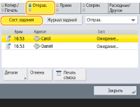 Нажмите <Детали> <Отправить повторно> для выполнения повторной отправки документов, которые не удалось отправить. Чтобы указать другого адресата, нажмите кнопку <Изменить адресата>. Если имеются документы с несколькими адресатами, для указания которых использовался один и тот же способ отправки, нажмите кнопку <Спис.шир. передачи>, выберите адресата, а затем нажмите кнопку <Отправить повторно> или <Изменить адресата>.Если для параметра <Удал. неудавшихся заданий на передачу> задано значение <Выкл.> (<Удал. неудавшихся заданий на передачу>), документы можно отправить повторно. Обратите внимание, что документы, отправленные с помощью функций прямой передачи, отправки вручную или функции факсимильной связи через ПК, не удастся отправить повторно. Для документов, отправка которых запланирована на определенное время, а также для документов, отправить которые не удалось, можно изменить адресатов. Обратите внимание, что невозможно изменить адресатов для документов с несколькими адресатами в процессе отправки таких документов, а также в случае, если возможность указать нового адресата ограничена (Ограничение круга адресатов). Адресата можно изменить для задания, отмененного из-за сбоя передачи, или задания, ожидающего передачи в режиме «Передача по расписанию». Нельзя изменить несколько адресатов одновременно. Кроме того, невозможно одновременно изменить адресатов в группе. |