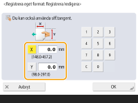 Ange längden på sidan <X> och sidan <Y>. Tryck på <X> eller <Y> för att ange längden på varje sida med sifferknapparna.