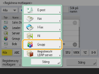 ![]() | Flera mottagare som har registrerats i adressboken (Registrera mottagare i adressboken) kan kombineras till en grupp. Du kan använda den här funktionen för att skicka dokument och säkerhetskopiera dina data samtidigt eftersom olika typer av mottagare kan registreras i samma grupp. Du kan exempelvis registrera e-postadresser och IP-adresser för filservern tillsammans i en grupp. |