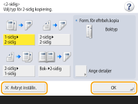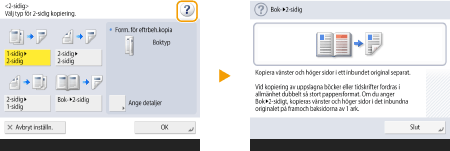 Visa funktionsguidenTryck på <Vägledning> för att visa en skärmbild som ger en introduktion till vad du kan göra med funktionerna i maskinen samt tips för att kopiera, scanna etc. Visa den här skärmbilden när du vill lära dig mer om vilka funktioner som finns och hur du kan använda dem. ![]() Exempel: Vägledning för kopieringsfunktioner När du väljer ett alternativ i listan visas handledningsskärmbilden. ![]() Använda hjälpfunktionenBeroende på vilken funktion som visas, visas ibland uppe till höger på skärmen. Tryck på för att kontrollera beskrivning och funktionsmetod för funktionen.![]() Tryck på <Slut> för att återgå till föregående skärm. Fungerar på samma sätt som med en smartphone (nyp/dra och släpp)På vissa skärmbilder kan du växla sida eller scrolla genom att dra fingret upp/ned eller åt vänster/höger på skärmbilden på samma sätt som med en smartphone. ![]() ![]() Du kan också inaktivera nypfunktionerna. <Använd funktion för att Svepa> Nypfunktioner samt dra- och släppåtgärder kan inte användas när <Invertera skärmfärger> är inställt som <På>. <Invertera skärmfärger> På en skärm med flyttbara knappar kan knapparna dras och släppas. ![]() |