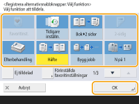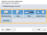 Antalet inställningsalternativ på skärmbilden med grundläggande funktioner för kopiering och platsen de visas på varierar beroende på funktionerna. En genvägsknapp visas inte om <Ej tilldelad> är inställd som en genväg. Begränsning för antalet genvägar för <Alternativ> som du kan registrera är enligt följande. Kopiering: 5 Fax: 4 Scanna och skicka: 2 |