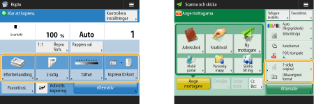 Du kan ändra vilka inställningsknappar som visas på skärmbilderna med grundläggande funktioner (för kopiering, fax och scanning). Du kan även visa en annan grundläggande funktionsskärmbild anpassad för varje inloggad användare.