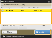 ![]() | Med den här funktionen kan du skydda mottagna dokument som uppfyller vissa villkor genom att lagra dem på en angiven lagringsplats (inlåda för konfidentiella fax). Inlådan för konfidentiella fax innehåller flera lådor, och varje låda går att skydda med ett lösenord. Genom att ange ett villkor, t.ex. att alla dokument från företag A ska sparas i låda 10, kan du begränsa åtkomsten till olika dokument. Den här funktionen kan också konfigureras med lösenord som förhindrar att obehöriga tar del av konfidentiella dokument oavsiktligt. När indikatorn Bearbetar/Data lyser ihållande grönt på kontrollpanelen följer du anvisningarna nedan för att kontrollera/skriva ut sparade dokument. |