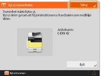 Information om trumenhetens modellnummer finns i Utbytesdelar. Trumenhetens bytesmeddelande visas längst ned på skärmen och kan variera beroende på avtalet. Tryck på <Stäng> när du bytt trumenheten. |