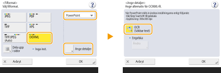 1 | Välj <OOXML> välj <PowerPoint> i listrutan. tryck på <Ange detaljer> <OCR (Sökbar text)>.![]() |