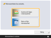 Om <Välj detta vid anslutning av minnesenhet> är inställt på <På>, visas genvägar till tillgängliga funktioner när du sätter i en minnesenhet. <Välj detta vid anslutning av minnesenhet> ![]() Eftersom genvägarna inte visas om maskinen är i viloläge, sätter du i minnesenheten efter att maskinen har återgått från viloläge. |