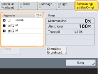 Pappersstoppet har inte nödvändigtvis skett på platsen du kontrollerar. I sådana fall följer du instruktionerna på skärmen och kontrollerar alla platserna. Skärmen fortsätter att visa att ett pappersstopp har skett tills du rensar pappersstoppet. Om du trycker på <Stäng> på skärmen som visar att ett pappersstopp har skett kan du fortsätta att utföra åtgärder och ange inställningar utan att omedelbart avlägsna pappersstoppet. Avlägsna inte papper från andra platser än de som anges att ha pappersstopp på skärmen. Detta kan orsaka pappersstopp på andra platser eller göra att sidor saknas i utmatade dokument. |