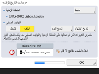 حدد تاريخ ووقت الجهاز. ![]() ![]() أدخل التاريخ والوقت، ثم اضغط على <موافق>. اضبط <المنطقة الزمنية> و<التوقيت الصيفي> حسب الاقتضاء. للمزيد من المعلومات، راجع ضبط التاريخ/الوقت. | |