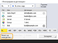 Когато регистрирате дестинация: <Сист. контрол>  <Изпращане> <Рег. на зад.> изберете дестинацията за регистриране  <Регистрир. на дестинац.>  регистрирайте дестинацията от екрана за регистриране за всеки тип дестинация