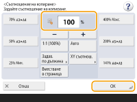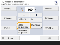 ![]() | Можете да увеличавате или намалявате чрез задаване на съотношение на копиране (%). Можете да задавате поотделно вертикално и хоризонтално съотношение. Увеличаване или намаляване на копията чрез задаване на съотношение на копиране | |