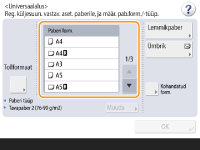 1 | Vajutage <Ümbrik>. Ümbriku paberitüüpi ei saa valida menüü <Paberi tüüp> üksikasjade kuvalt. Ümbriku paberitüübi valimiseks, registreerige paberitüüp kuval <Lemmikpaberi salvestus (universaalalus)>, vajutage <Lemmikpaber> 2. Kuval vajutage nuppu, millega on seotud ümbrikupaberi tüüp <OK>. Universaalsalves sageli kasutatava paberiformaadi ja -tüübi salvestamine |