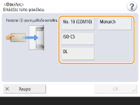 1 | Πατήστε <Φάκελος>. Ο τύπος χαρτιού φακέλου δεν μπορεί να επιλεγεί από την οθόνη λεπτομερειών του <Τύπος Χαρτιού>. Για να επιλέξετε τύπο χαρτιού φακέλου, καταχωρήστε τον τύπο χαρτιού στο <Αποθήκευση Αγαπημένου Χαρτιού (Δίσκος ΠΧ)> και, στη συνέχεια, πατήστε <Αγαπημένο Χαρτί> στο βήμα 2 και το κουμπί στο οποίο έχει καταχωρηθεί ο τύπος χαρτιού φακέλου <OK>. Καθορισμός συχνά χρησιμοποιούμενου μεγέθους και τύπου χαρτιού για τον δίσκο πολλαπλών χρήσεων |