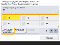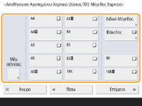 Εάν το <Ορισμός Πάντα> στις ρυθμίσεις <Προεπιλογές Δίσκου Πολλαπλών Χρήσεων> έχει οριστεί στο <Αγαπημένο Χαρτί>, εμφανίζεται μια οθόνη που σας δίνει τη δυνατότητα να επιλέξετε το "Αγαπημένο χαρτί" σας όταν τοποθετείτε το χαρτί στο δίσκο πολλαπλών χρήσεων. <Προεπιλογές Δίσκου Πολλαπλών Χρήσεων> |