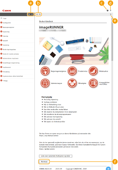 Klikk for å vise informasjon om hvordan du viser Brukerhåndbok, hvordan du søker og annen informasjon.