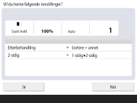For å registrere en personlig knapp må du logge på med personlig godkjenningsstyring. Konfigurere innstillingene for personlig godkjenningsstyring Hvis du velger <Aut.info for enh.innlogg.> for <Info. brukt til autentisering av filsending/gjennomsyn>, lagres det ikke et passord for en filmottaker i en personlig knapp. <Info. brukt til autentisering av filsending/gjennomsyn> Hvis du vil ha informasjon om det maksimale antallet personlige knapper og delte knapper som kan registreres, kan du se Administreringsfunksjoner. Personlige knapper kan ikke endres til delte knapper, og omvendt. For å gjøre dette henter du innstillingene og registrerer en annen knapp fra <Menu>. Trykk og hold nede en knapp for å endre navnet/kommentaren eller flytte/slette den. De samme handlingene (endre navnet/kommentaren til en knapp eller flytte/slette en knapp) kan utføres fra <Menu> på <Hjem>-skjermbildet. Tilpasse <Hjem>-skjermbildet Personlige knapper kan deles mellom flere enheter ved å synkronisere egendefinert data. Liste over elementer som kan personlig tilpasses Innstillinger som kan registreres i personlige knapper / delte knapperFunksjoner og innstillinger som kan registreres i personlige knapper / delte knapper, er angitt nedenfor. Innstillinger som kan registreres i <Favorittinnst.> for <Kopi>-funksjonen Forminskningsoperasjoner for kopiering <Faks>-funksjonsinnstillingene til maskinen Grunnleggende operasjoner for sending av faks Innstillinger som kan registreres i <Favorittinnst.> for <Skanne og sende>-funksjonen Nyttige skannefunksjoner Innstillinger som kan registreres i <Favorittinnst.> for <Skanne og lagre>-funksjonen Innstillingsskjerm og operasjoner for skanning som skal lagres Lagre plasseringer for <Skanne og lagre>- og <Tilgang lagrete filer>-funksjoneneBruke lagringsplass Snarveier til skjermbildet Grunnleggende funksjoner for <Faks/I-faks innboks>-funksjonen Tilgang til en server og påloggingspassordet kan registreres til personlige knapper / delte knapper. Dette er praktisk for å hoppe over inntasting av passord når den registrerte knappen hentes. Hvis du vil angi passord i innstillingene lagret i den registrerte knappen, siden du ofte importerer innstillinger i en personlig knapp eller delt knapp til en annen maskin, og du vil forhindre brukere fra å utgi seg for å være andre brukere, må du ekskludere et passord ved registrering. Importere/eksportere de registrerte knappeneDu kan importere og eksportere de registrerte personlige/delte knappene fra Fjernkontroll. Importere/eksportere alle innstillinger De personlige knappene / delte knappene til enhetene i imageRUNNER ADVANCE-serien som har Hurtigmeny-funksjonen, kan importeres/eksporteres som personlige knapper / delte knapper. |