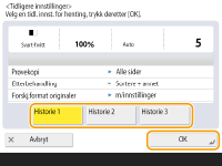 | | Du kan hente tidligere brukte kopiinnstillinger. Detaljer om innstillingen som ble hentet, kan endres før kopiering. |