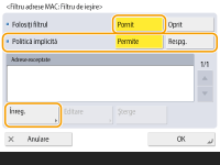 Setaţi <Folosiţi filtrul> la <Pornit>, selectaţi <Politică implicită>, apoi apăsaţi <Înregistrare>.