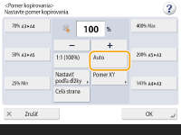 Ak ste špecifikovali možnosť <Automat. pomer XY>, vyberte papier v časti <Vybrať papier>. Ak nešpecifikujete formát papiera, pomer kopírovania sa nastaví automaticky tak, aby sa zhodoval s papierom vloženým v zásuvke na papier 1.