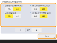 <Zvok za Način mirovanja> | Zvok ob preklopu naprave v način pripravljenosti ali če se naprava izklopi, če možnost <Nast. Hitrega zagona za glavno napajanje> nastavite na <Da>. (Odvisno od okoliščin lahko zagon naprave traja dalj časa in ni zvoka.) |