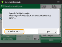 Preverjanje skupnega števila navedenih prejemnikovSkupno število izbranih prejemnikov je prikazano na vrhu zaslona. Tako lahko pred pošiljanjem preverite, ali je število prejemnikov pravilno. Pošiljanje z informacijami o pošiljateljuPreverjanje stanja poslanih dokumentovKo je možnost <Prikaz obvestila, ko je opravilo sprejeto> nastavljena na <Da>, je mogoče zaslon <Nadzor stanja> prikazati s tega zaslona, ki se prikaže, ko je poslano opravilo prejeto. <Prikaz obvestila, ko je opravilo sprejeto>Tiskanje poročila z rezultati pošiljanjaČe želite v razdelku <Opcije> to nastaviti za vsa opravila, morate v razdelku <Poročilo o rezultatu ODD> izbrati <Samo ob napaki> ali <Ne> in nato nastaviti <Omogoči izpisovanje z opcij> na <Da>. Varno pošiljanje datotek |