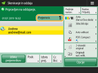 Zaslon z osnovnimi nastavitvami optičnega branjaIzbiranje prejemnikov v imeniku