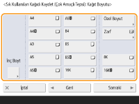 <Çok Amaçlı Tepsi Varsayılanları> bölümündeki <Daima Belirle> seçeneği <Sık Kullanılan Kağıt> olarak ayarlandıysa, kağıdı çok amaçlı tepsinin içine yüklediğinizde "Sık Kullanılan Kağıt" tercihinizi belirtmenizi sağlayan bir ekran görüntülenir. <Çok Amaçlı Tepsi Varsayılanları> |