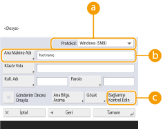 <Gönderim Öncesi Onayla> seçeneğinin <Açık> olarak ayarlandığı bir dosya sunucusuna/Gelişmiş Alan öğesine gönderim yapmayı denerseniz kullanıcı adı ve parola girmenizi isteyen bir ekran görünür. Bu durumda, önceden ayarlanan parolayı girin. Bir grup adresine dosya sunucusu/Gelişmiş Alan kaydetmek istiyorsanız <Gönderim Öncesi Onayla> seçeneğini <Kapalı> olarak ayarlayın. <Gönderim Öncesi Onayla> seçeneğinin <Açık> olarak ayarlandığı bir dosya sunucusunu/Gelişmiş Alan öğesini içeren bir grup adresine gönderim yapamazsınız.