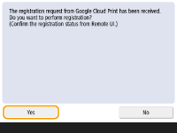 ثبت از دستگاه همراه یا Google Chromeمی توانید دستگاه را از دستگاه همراه یا Google Chrome ثبت کنید. قبل از آن که ثبت تکمیل شود، صفحه تأیید زیر روی صفحه دستگاه نشان داده می شود. <Yes> را برای کامل کردن ثبت فشار دهید. برای مشاهده اطلاعات مربوط به روش های ثبت، به دفترچه راهنمای دستگاه یا صفحه خانگی Google Cloud Print مراجعه کنید. |