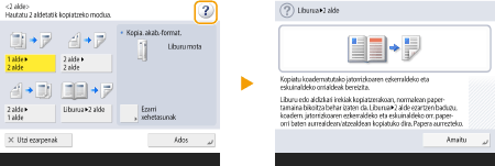 Ikusi funtzioen gidaSakatu <Tutoriala> makinaren funtzioekin egin dezakezuna erakutsiko dizun pantaila eta kopiatzea, eskaneatzea eta abar erabiltzeko gomendioak bistaratzeko. Ikusi pantaila hori gehiago jakiteko erabilgarri dauden funtzioen inguruan eta horiek nola erabili jakiteko. ![]() Adibidea: Kopiatze funtzioen tutoriala Zerrendatik elementu bat aukeratzen duzunean, bistaratu egingo da tutorialaren pantaila. ![]() Erabili Laguntza-funtzioaBistaratutako funtzioaren arabera, batzuetan pantailaren goialdeko eskuinean bistaratuko da. Sakatu deskribapena eta funtzioaren eragiketa-metodoa ikusteko.![]() Sakatu <Amaitu> aurreko pantailara itzultzeko. Telefono adimenduna erabiltzen duzun modura egin ditzakezu eragiketak (orria pasatzea edo arrastatu eta jaregin)Pantaila batzuetan, orrialdea alda edo korritu dezakezu hatza bizkor pasaz gora/behera edo ezker/eskuin pantailan smartphonearekin egingo zenukeen moduan. ![]() ![]() Mugimendu-eragiketak desgaitu ditzakezu ere bai. <Erabili Pasatu hatza funtzioa> Orria pasatzeko eta arrastatu eta jaregiteko eragiketak ezin daitezke erabili <Alderantzikatu pantailako koloreak> aukera <Bai> gisa ezarrita dagoenean. <Alderantzikatu pantailako koloreak> Botoi higigarriak dituzten pantailetan, botoiak arrastatu eta jaregin egin daitezke horiek mugitzeko. ![]() |