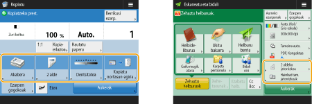 Aldatu egin dezakezu oinarrizko eginbideen pantailetan bistaratzen diren ezarpen-botoiak (kopiatu, faxak bidali eta eskaneatzeko). Horretaz gain, pertsonalizatutako oinarrizko eginbideen pantaila desberdina bistara dezakezu saioa hasitako erabiltzaile bakoitzarentzat.