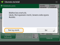 Zehaztutako helmuga kopurua egiaztatzekoZehaztutako helmuga kopurua osoa pantailaren goiko aldean agertuko da. Horrek helmuga kopurua zuzena dela baieztatzea ahalbidetuko dizu bidalketa egin baino lehen. Bidaltzailearen informazioarekin bidaltzekoBidalitako dokumentuen egoerak egiaztatzeko<Bistaratu jakinarazpena lana onartzen denean>-ko <Bai> ezarrita dagoenean, <Egoera-monit. pantaila bistaratu daiteke ondorengo pantailatik, bidalitako mezua jaso ostean agertuko dena. <Bistaratu jakinarazpena lana onartzen denean>Bidalketaren emaitzaren txostena inprimatzeko<Aukerak>-(e)tik lan bakoitzerako hau ezartzeko, <TX emaitzaren txostena>-(e)an <Erroreetarako soilik> edo <Ez> hautatu eta ondoren <Onartu aukeretatik inprimatzea>-ko <Bai> ezarri. Fitxategiak modu babesean bidaltzeko |