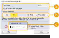 <Ordu-zona> edo <Udako ordutegia> ezarpena aldatuz gero, makina berrabiarazi behar duzu itzaltzeko etengailua sakatuta. Sakatu etengailua makina itzaltzeko ( Makina itzaltzea). Ukipen-pantaila eta adierazleak itzali eta 10 segundo edo gehiago igarotakoan, piztu makina berriz ( Makina piztea). |