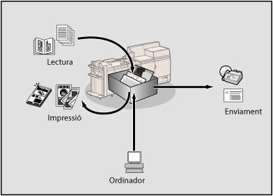 Permet als usuaris emmagatzemar fitxers llegits amb aquest equip o dades enviades des d'un ordinador personal mitjançant el controlador d'impressora. Podeu imprimir un document desat quan sigui necessari amb les opcions que preferiu. També podeu convertir el format de fitxer dels documents en un altre format, com ara PDF, per enviar-los per correu electrònic amb la funció Enviar.