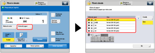 Si premeu [Detalls], apareixerà la informació detallada sobre el paper seleccionat. Si premeu [ ], podeu visualitzar o amagar la il·lustració del dispositiu. Per a més informació, vegeu "Canvi de la vista predeterminada de la pantalla de llista Selecció paper ". |