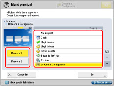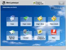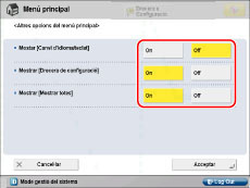 Per especificar les opcions de la pantalla del menú principal, heu d'iniciar sessió a l'equip com a administrador. De manera predeterminada, les opcions d'administració del sistema (ID d'admdor. del sistema/PIN del sistema) estan activades a l'equip. Per tant, l'administrador ha d'iniciar la sessió introduint l'identificador d'administrador i el PIN del sistema a la pantalla Configuració. L'opció predeterminada tant per a la identificació de l'administrador com per al PIN del sistema és "7654321". Si el nombre de botons de funcions supera el nombre de botons del disseny especificat a <Botons del menú principal>, els botons restants es mostren després de la pàgina 2 de la pantalla Menú principal. A la pantalla Menú principal es poden visualitzar, com a màxim, 16 botons. Si premeu [Mostra'ls tots] a la pantalla Menú principal, podeu visualitzar tots els botons en l'ordre predeterminat, fins i tot si heu modificat l'aparença dels botons. Per tornar a la pantalla personalitzada, torneu a prémer [Mostra'ls tots]. Per a més informació sobre [Canviar idioma/teclat], vegeu "Activació del canvi d'idioma/teclat". Per a més informació sobre [Ajust auto de gradació], [Opcions de paper], i [Opcions de gestió de tipus de paper], vegeu "Ajust automàtic de la gradació:". "Desament de la mida i el tipus de paper de l'origen de paper", i " Descripció d'aquesta funció". Els salts de línia utilitzats en desar pàgines web es mostren al nom dels botons de la pàgina web a la pantalla Menú principal. |