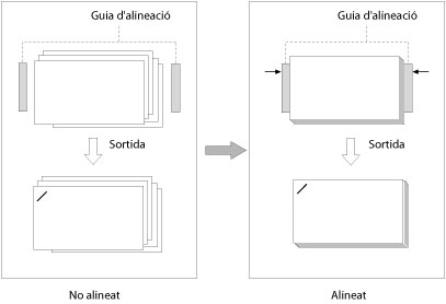 El paper copiat o imprès pot encongir a causa de la temperatura, la humitat o una característica del tipus de paper. En aquest cas, aquest mode permet alinear papers copiats o impresos ajustant la posició de la guia d'alineació dins de la unitat d'acabat per grapar els papers alineats.