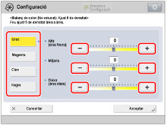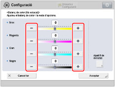 Seleccioneu el color que voleu ajustar → premeu [-] o [+] per ajustar el nivell de les àrees de densitat més fosques (alta), mitjanes i més clares (baixa).