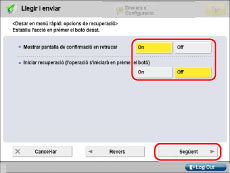 Si seleccioneu [On], en recuperar el botó desat es visualitzarà el quadre de diàleg de confirmació de les opcions. Per a més informació sobre el quadre de diàleg de confirmació de les opcions, vegeu