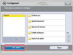 Les funcions disponibles a la pantalla Configuració no són les mateixes per als administradors que per als usuaris generals. Per als administradors: L'administrador del sistema pot especificar totes les opcions del sistema per a l'equip. De manera predeterminada, les opcions d'administració del sistema (ID d'admdor. del sistema/PIN del sistema) estan activades a l'equip. Per tant, l'administrador ha d'iniciar sessió introduint la ID d'administrador del sistema i el PIN del sistema. L'opció predeterminada tant per a la identificació de l'administrador com per al PIN del sistema és "7654321". Es recomana que canvieu tant la ID de l'administrador del sistema com el PIN del sistema. Per obtenir més informació sobre com establir l'ID d'administrador del sistema i el PIN del sistema, vegeu " Especificació de les opcions de l'administrador del sistema". Per obtenir informació sobre els elements de Configuració disponibles amb privilegis d'administrador, vegeu "Taula d'opcions d'administrador disponibles (Pantalla tàctil)" i "Taula d'opcions d'administrador disponibles (IU remot)". Per als usuaris generals: És possible que alguns elements de la pantalla Configuració estiguin restringits per als usuaris generals. Els elements per als quals un usuari no té privilegis d'ús estan atenuats i no es poden seleccionar a la pantalla tàctil. Els elements per als quals un usuari no té privilegis d'ús no es mostren a la IU remot. |