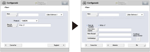 Podeu introduir un màxim de 128 caràcters alfanumèrics per al [Nom de l'amfitrió] al tauler de control. A més, també podeu introduir un màxim de 255 caràcters alfanumèrics per al [Camí de la carpeta]. Especifiqueu les opcions del servidor respectant el límit de caràcters. Si canvieu l'idioma de la pantalla tàctil, és possible que [Nom de l'amfitrió] i el [Camí de la carpeta] no es visualitzin correctament. Si l'idioma de la pantalla tàctil no coincideix amb el de l'ordinador emprat com a navegador principal, és possible que el [Nom de l'amfitrió] i el [Camí de la carpeta] no apareguin correctament o que no pugueu explorar els directoris. Per fer un enviament a un amfitrió IPv6, configureu el [Nom de l'amfitrió] utilitzant el format següent: <Adreça IPv6>:<Número de port> Exemple: [5aed:90a0:bc05:01d2:568a:2fc0:0001:12ee]:21000 |