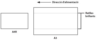 Quan s'utilitza paper amb una amplada superior després de copiar o imprimir 100 fulls o més amb una amplada inferior (per exemple, quan utilitzeu paper A3 després de paper A4R), pot ser que apareguin bandes brillants a les dues vores en la direcció de l'alimentació. A més a més, pot ser que apareguin taques de brillantor irregular a les àrees d'alta densitat del paper gruixut o estucat imprès. En aquest cas, les bandes i les taques de brillantor irregular es poden reduir netejant el rodet de fixació i la seva superfície.