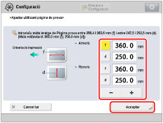 [F]: | Introduïu la longitud mesurada de la marca "f" a la pàgina de prova (per al full llarg: introduïu el valor d'entrada calculat a partir de la longitud mesurada de la marca "f" a la pàgina de prova de fulls llargs. Valor d'entrada = ([valor predeterminat "f": 360 mm]/[posició mesurada "f": 450, 550, 650 mm]) x valor mesurat "f". |
